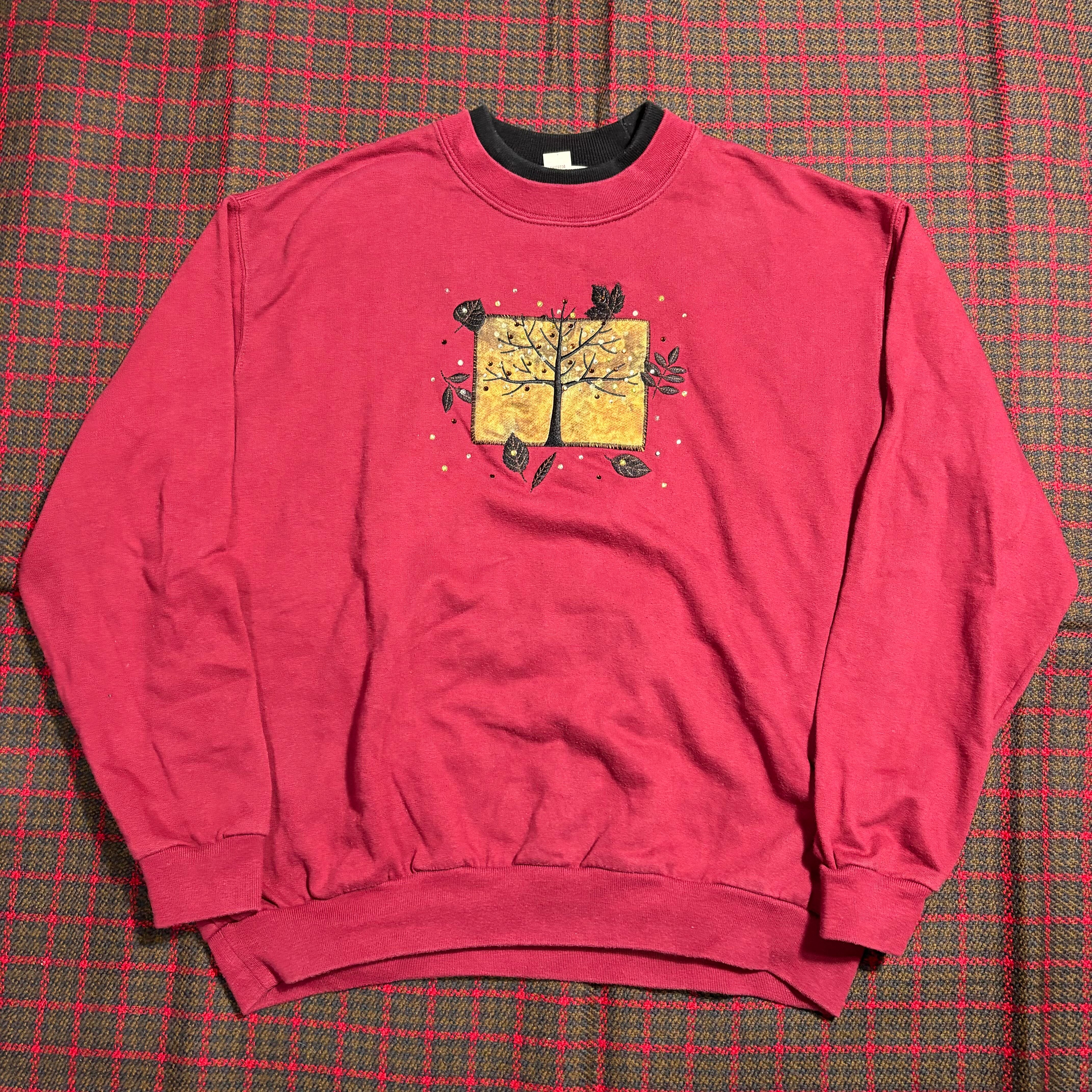 90s〜00s TOP STLTCH 枯れ木 デザイン パール 刺繍 スウェット トレーナー color.レッド size.M相当
